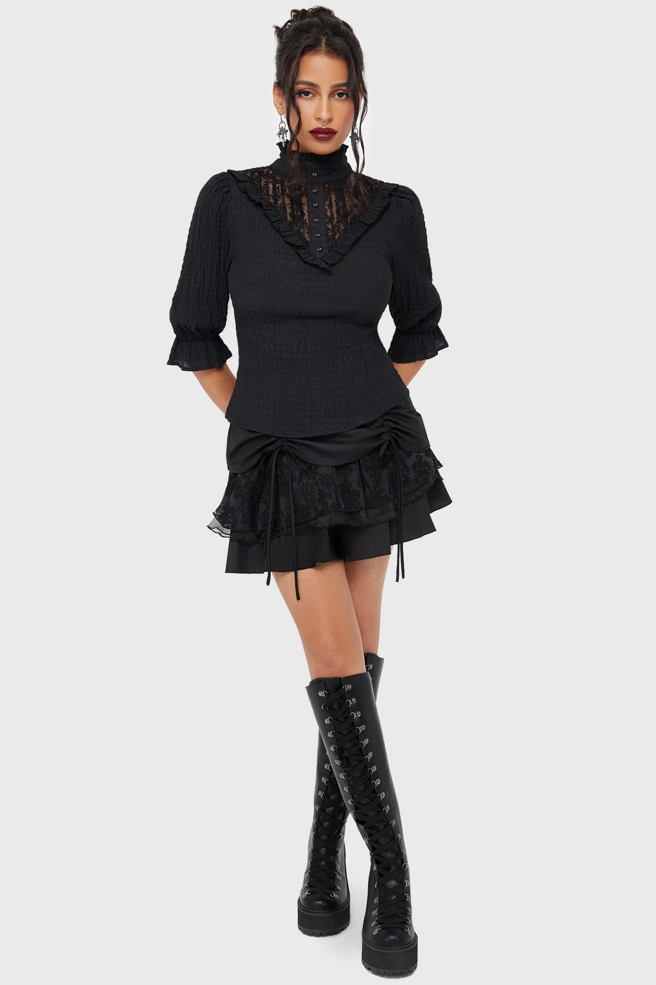 - Burnout patterned organza, front yoke with pin tucks and black fabric covered buttons.